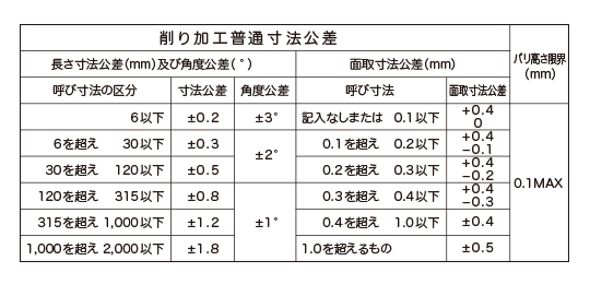 削り加工の公差は、図面の脇に段階ごとの公差表を入れてあると分かりやすく、トラブルも発生しにくくなります。 ex.長さ、面取り、角度、バリ高さ
